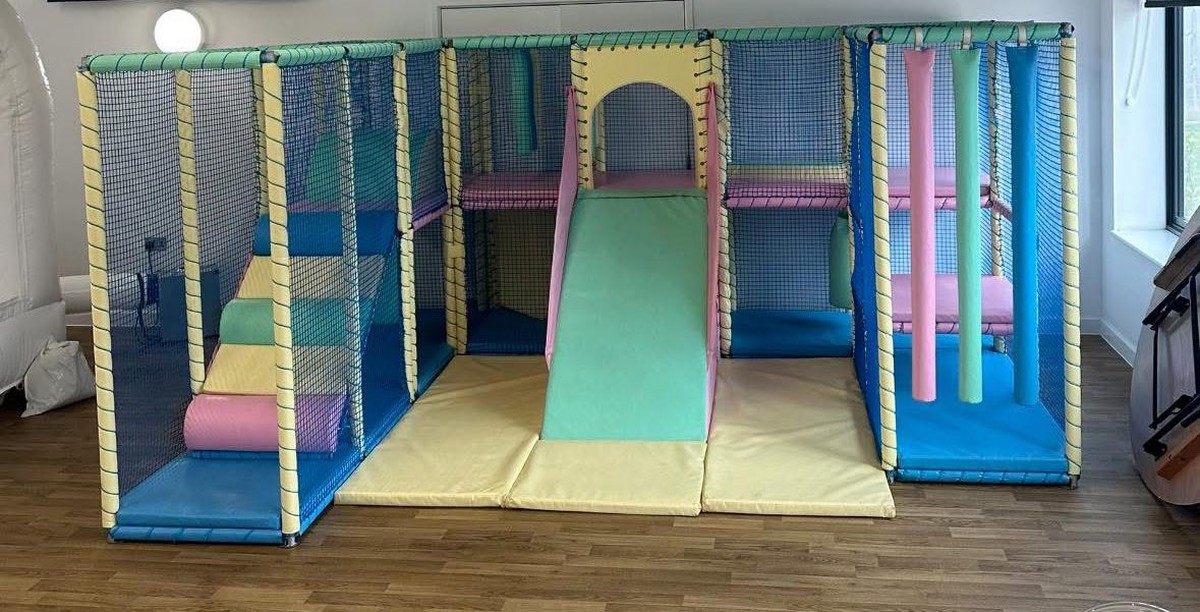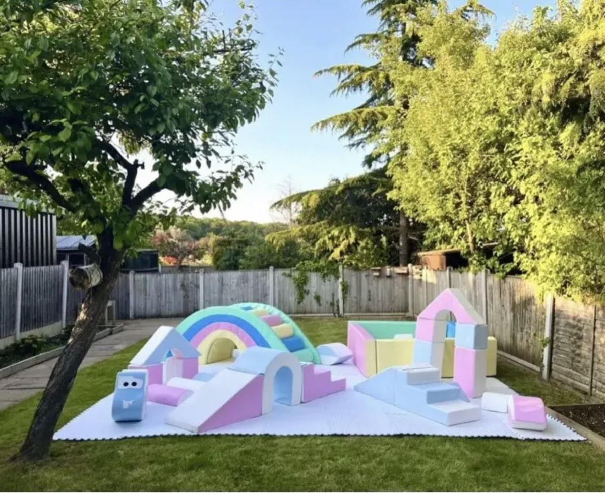 Stunning pastel soft play equipment for sale including a 5 piece climbing frame with slide attachment.In great new condition.